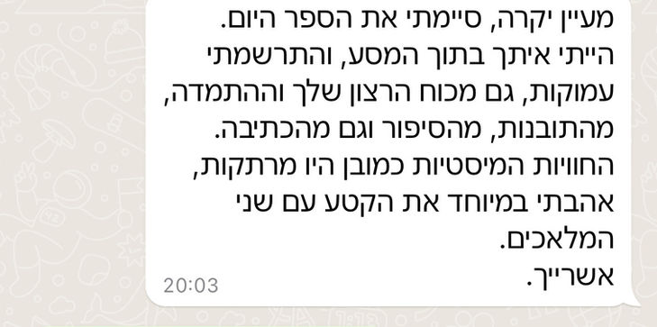 תזכרו ותדעו שאתם אף פעם לא לבד ויש מי ששומע את תפילותיכם, משאלותיכם ורצונותיכם העמוקים ביותר, תקבלו תובנות עמוקות לחיים חיי כאן הם נס גלוי, כיום שאני משוקמת לחלוטין, אמא ל4 מופלאים, מטפלת ומרצה המעוררת השראה, מוטיבציה ואמונה בלבבות האדם אני יודעת לומר שסיפורי הוא שליחות.